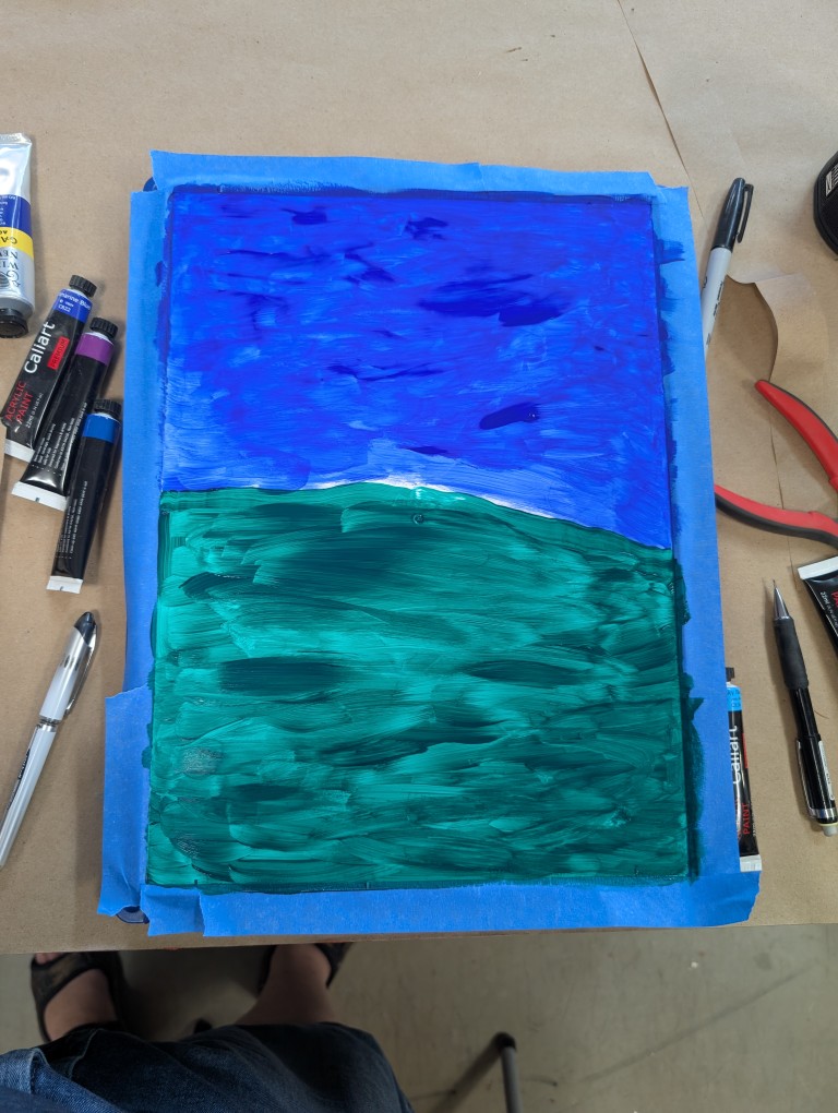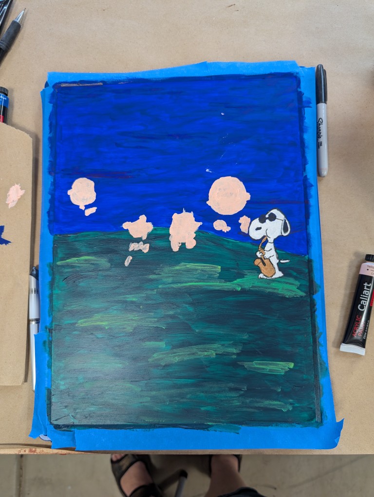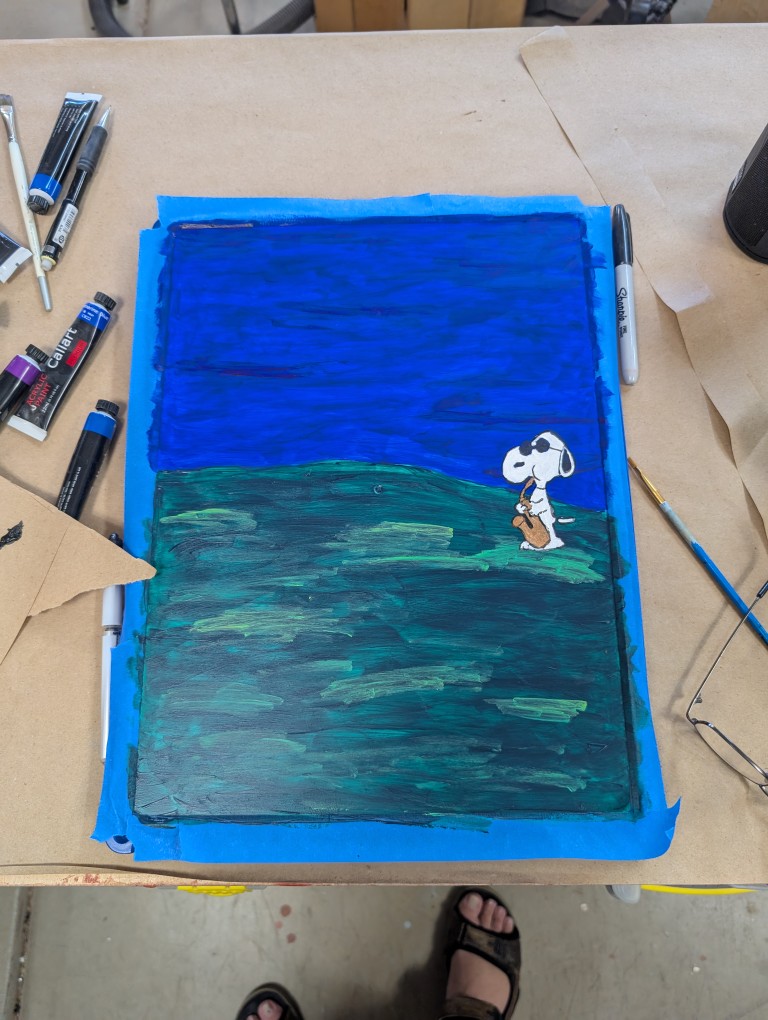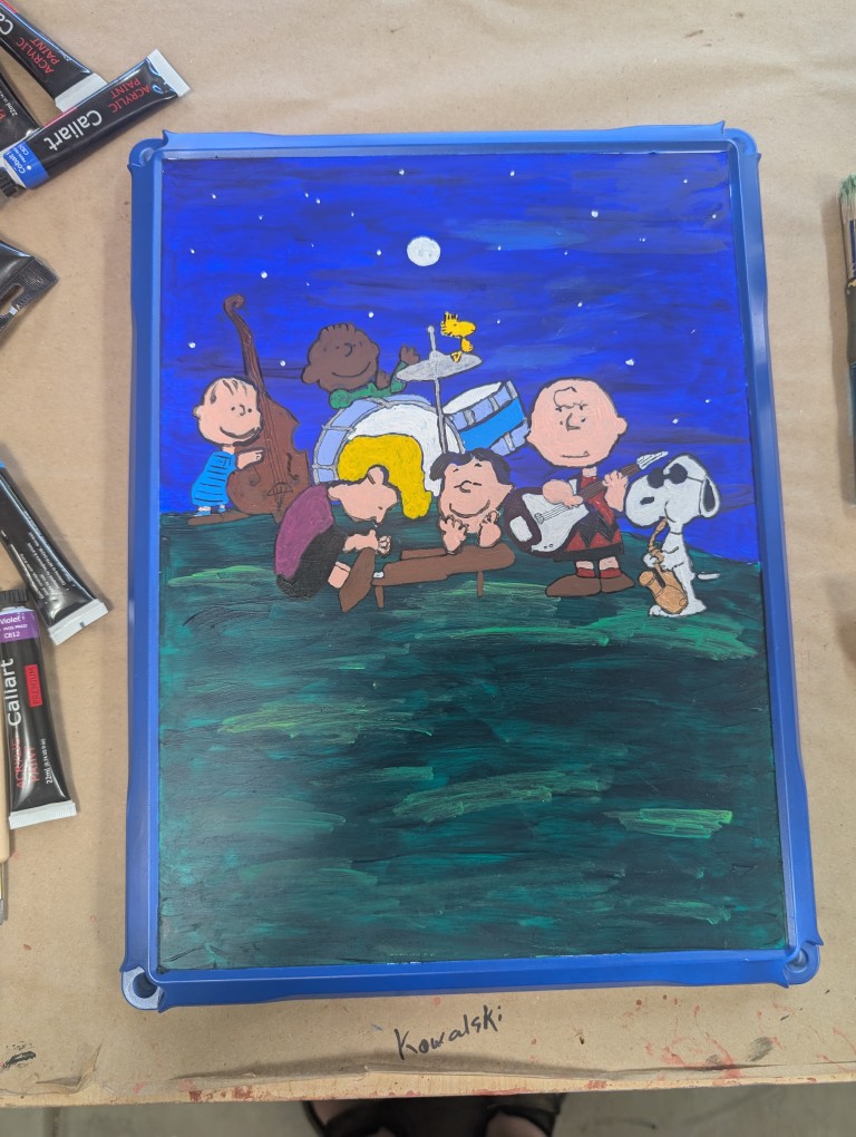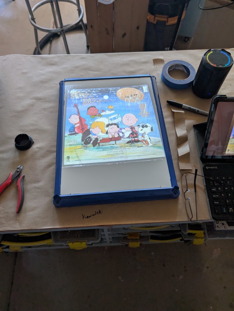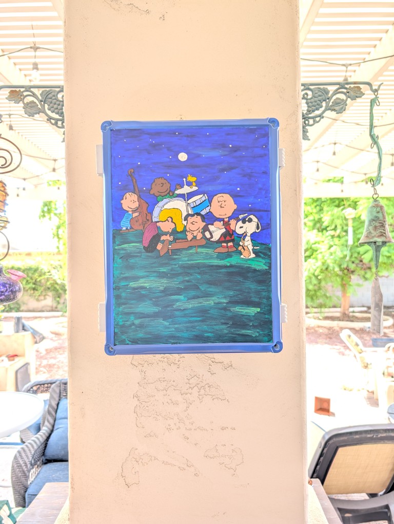 I needed an electrical box to keep the amplifier safe. It will also probably be a junction box for the power to the Penguin lights. Just putting a bland plastic box up there, doesn’t work for me. For the first box, I went with a Mai Tai theme. This time, I opted to go with a cartoon theme. I found a picture of the Peanuts gang playing instruments on the back of one of the Peanuts music CDs. Using the projector, I transferred the paper to the panel door. In general, it went well. I need to get some more opaque paints for the next painting project and it took a bit to figure out the best approach for the black lines (ink pens), but it came out as expected. I’m hoping the next painting attempt looks a little better.
